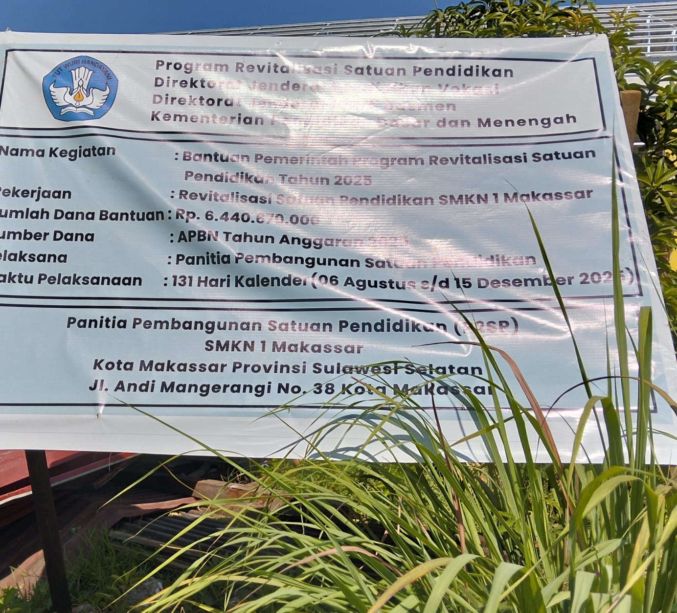 Makassar Buserterkini.com – Proyek revitalisasi SMK Negeri 1 Makassar di Jalan Andi Pangerangi No. 38, Kota Makassar, yang menghabiskan dana Rp 6.440.670.000 dari APBN Tahun Anggaran 2025, kini menjadi sorotan. Berdasarkan pantauan lapangan Buserterkini.com, progres pembangunan yang sedang berlangsung jauh dari kata memuaskan dan menimbulkan tanda tanya besar soal transparansi dan kualitas pekerjaan.