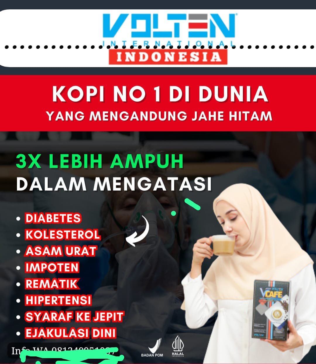 Vcafe Kopi Jahe Hitam No.1 Di dunia cukup 2 Gelas sehari Bantu atasi Diabetes,Asam Urat, Kolesterol, Rematik, Impoten, Hipertensi Dan Ejakulasi Dini. Sudah di akui dunia dan sudah Tersertifikasi BPOM, Rasanya Nikmat & Manis ( Tanpa Gula ) sangat aman untuk di konsumsi dan sudah terbukti berkhasiat.