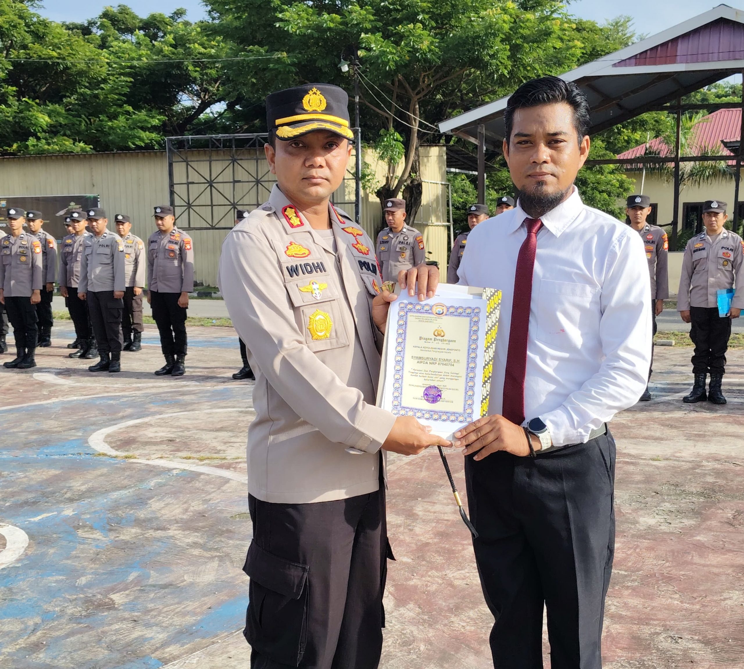 Jeneponto – Kapolres Jeneponto AKBP Widi Setiawan, S.I.K., M.I.K., memberikan penghargaan kepada personel yang menunjukkan kinerja luar biasa dalam menjalankan tugasnya. Penghargaan tersebut diberikan kepada Aipda Syam Suryadi Syarif, S.H., yang bertugas di Fungsi Reskrim sebagai Kaur Identifikasi Polres Jeneponto. Acara penghargaan berlangsung dalam apel pagi yang digelar pada Senin, 21 April 2025, di halaman Mapolres Jeneponto dan dihadiri oleh para pejabat utama (PJU), perwira, bintara, serta ASN Polres Jeneponto.