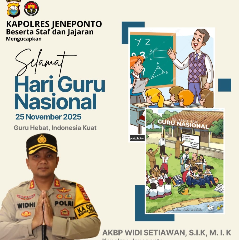 Dalam pernyataannya, Selasa (25/11/2025), Kapolres AKBP Widi Setiawan menegaskan peran strategis guru sebagai pahlawan tanpa tanda jasa yang telah membentuk karakter dan mencerdaskan kehidupan bangsa, khususnya di daerah Jeneponto.