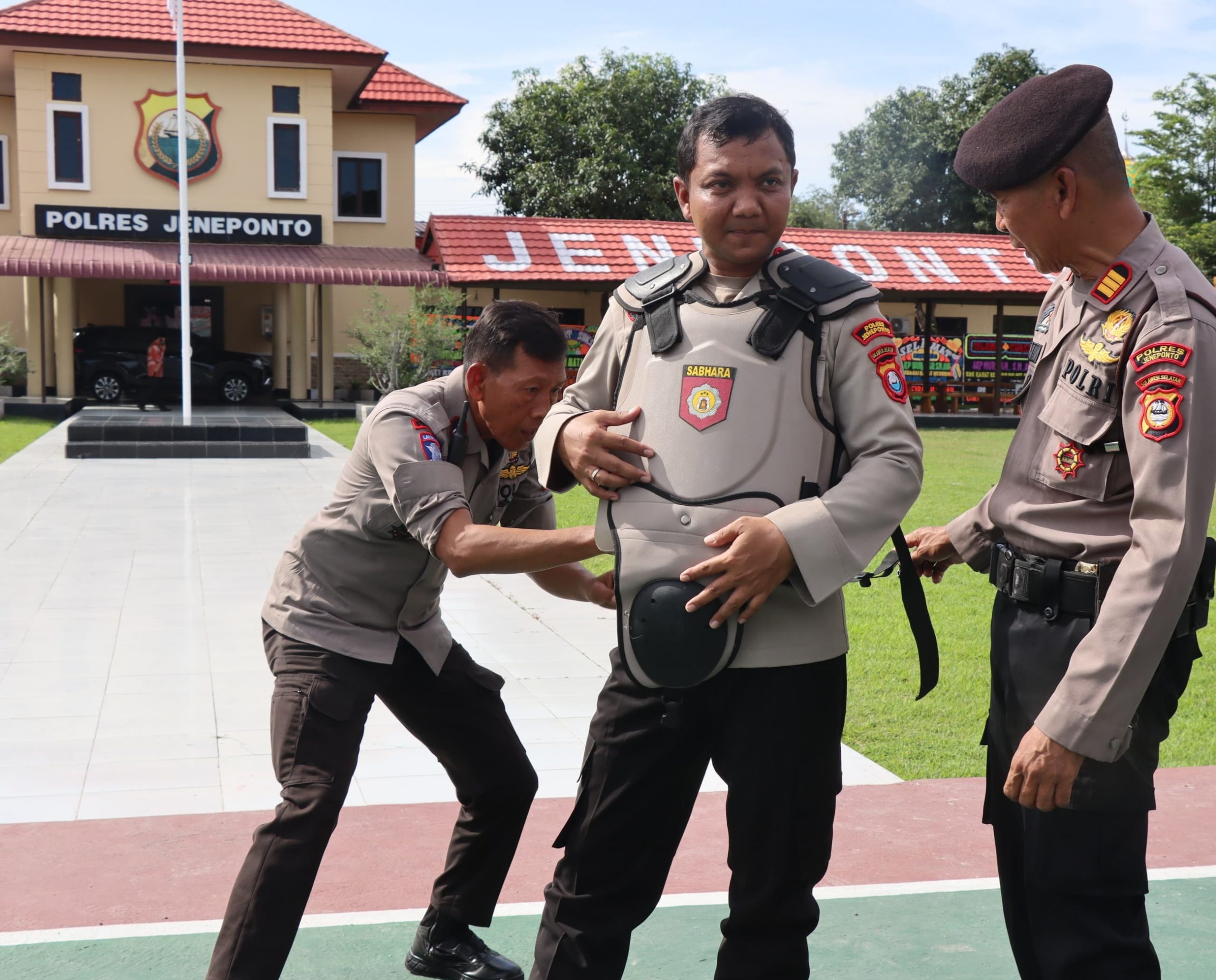 Yang membuat latihan ini berbeda adalah keterlibatan langsung para pimpinan. Kapolres Jeneponto, AKBP Widi Setiawan, tidak hanya memantau, tetapi turut mengenakan seragam lengkap Dalmas. Aksi ini langsung diikuti oleh seluruh perwira, mulai dari Pejabat Utama hingga para Perwira Staf Polres Jeneponto.