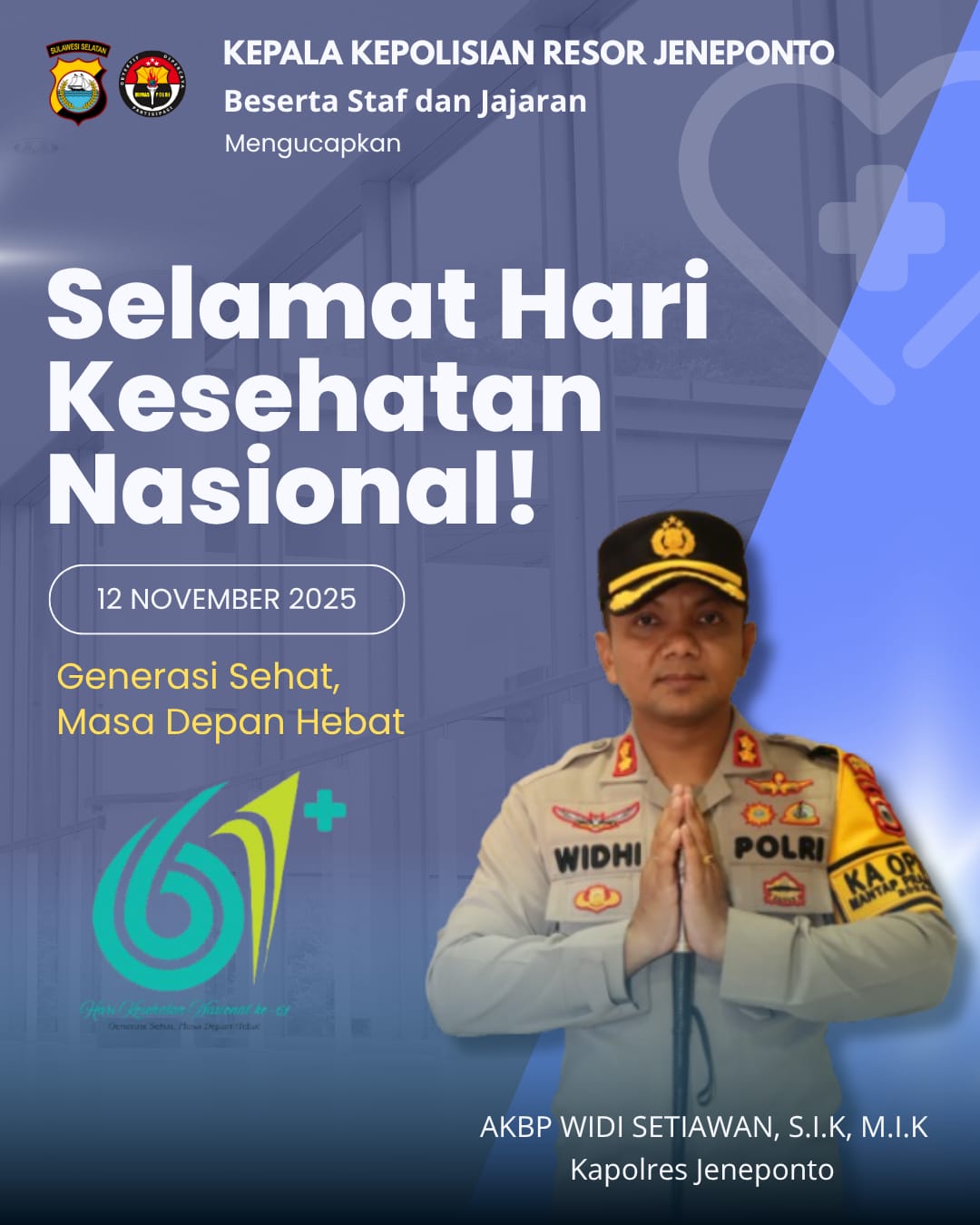 Jeneponto – Kapolres Jeneponto, AKBP Widi Setiawan, S.I.K, M.I.K, mengucapkan selamat memperingati Hari Kesehatan Nasional (HKN) yang jatuh pada tanggal 12 November 2025. Dalam momentum ini, Kapolres menyampaikan apresiasi dan penghargaan setinggi-tingginya kepada seluruh tenaga kesehatan yang telah berjuang tanpa kenal lelah dalam menjaga dan meningkatkan derajat kesehatan masyarakat.