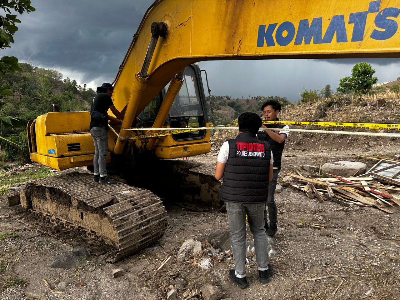 Tim menemukan satu unit alat berat excavator yang tidak dalam keadaan beroperasi namun keberadaan alat berat tersebut di duga kuat terkait dengan aktivitas penambangan tanpa izin yang merusak lingkungan dan Sebagai langkah pengamanan dan proses penyelidikan, polisi segera melakukan pemasangan police line pada alat berat tersebut.
