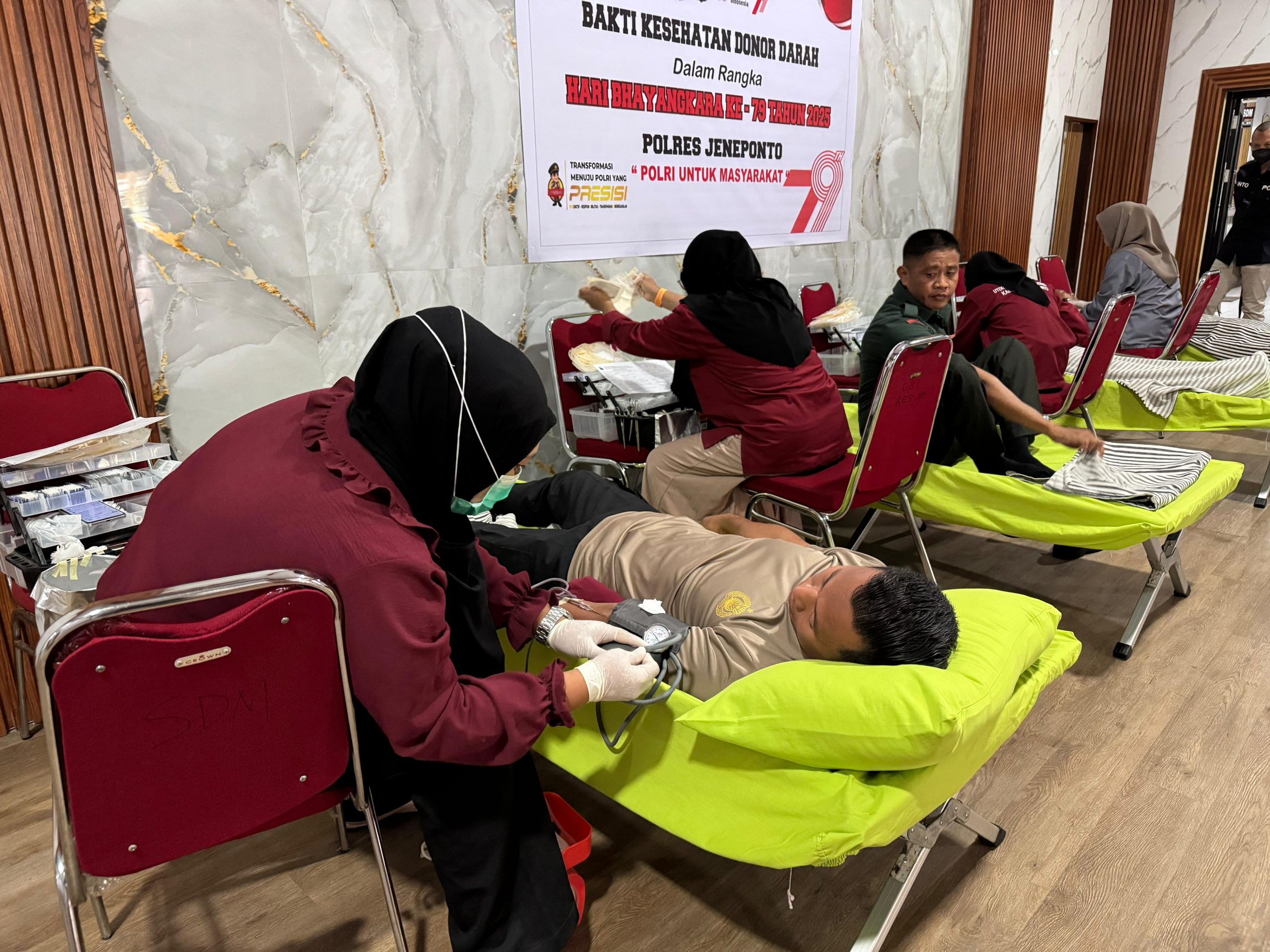 Jeneponto, 25 Juni 2025 — Dalam rangka memperingati Hari Bhayangkara ke-79, Polres Jeneponto menggelar kegiatan Bakti Kesehatan berupa donor darah pada Rabu pagi (25/06/2025) sekitar pukul 08.00 Wita, bertempat di Lobby Mapolres Jeneponto. Kegiatan ini merupakan wujud nyata pengabdian Polri kepada masyarakat, sesuai dengan tema Hari Bhayangkara tahun ini yakni “Polri untuk Masyarakat”.