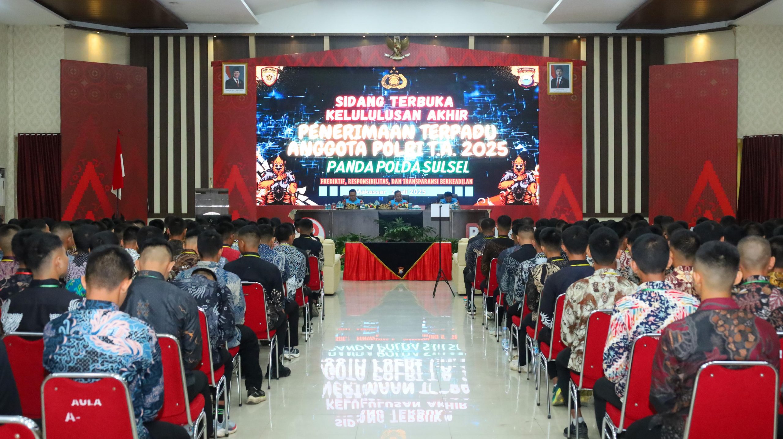 Makassar – Wakil Kepala Kepolisian Daerah (Wakapolda) Sulawesi Selatan, Brigjen Pol. Nasri, S.I.K., M.H., memimpin langsung Sidang Terbuka Kelulusan Akhir Tingkat Panda (Panitia Daerah) Penerimaan Terpadu Anggota Polri Tahun Anggaran 2025 di Aula Mappaoddang Mapolda Sulsel, Kamis (03/07/2025).